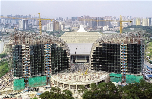 目前,會展中心改擴建工程配套設施G區、F區(后翼)正在緊鑼密鼓地建設中。記者近日來到項目建設現場看到,會展中心改擴建工程配套設施造型已顯現,2號、3號地塊上的建筑物猶如一朵盛開的鮮花,造型獨特,十分醒目。