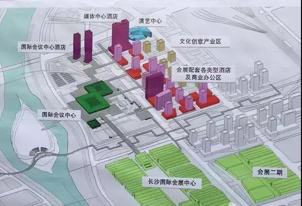 根據初步規劃,長沙高鐵會展新城將建設高鐵商務區,東臨金桂路,南至香樟路,西臨京港澳高速公路,北至勞動路。高鐵商務區作為長沙高鐵會展新城的核心區、示范區,將重點培育和發展會展經濟、總部經濟、商務經濟等主導產業。