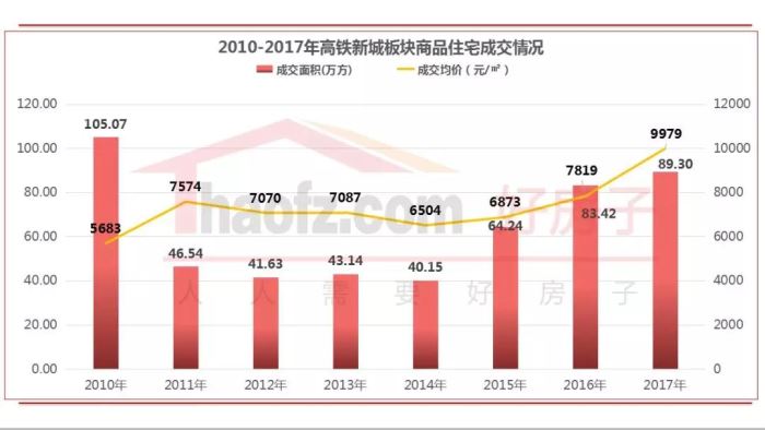 據克而瑞統計數據統計,自2010年起武廣高鐵通車帶來第一波開發熱潮后,高鐵新城板塊始終保持著穩健的發展。2017年高鐵新城成交商品住宅89.3萬方,環比上漲7%,成交均價9979元/㎡,環比上漲27.6%。在調控的大環境下板塊價值上升到新的水平,與梅溪湖板塊、濱江新城一并成為長沙樓市最受關注的三大板塊。