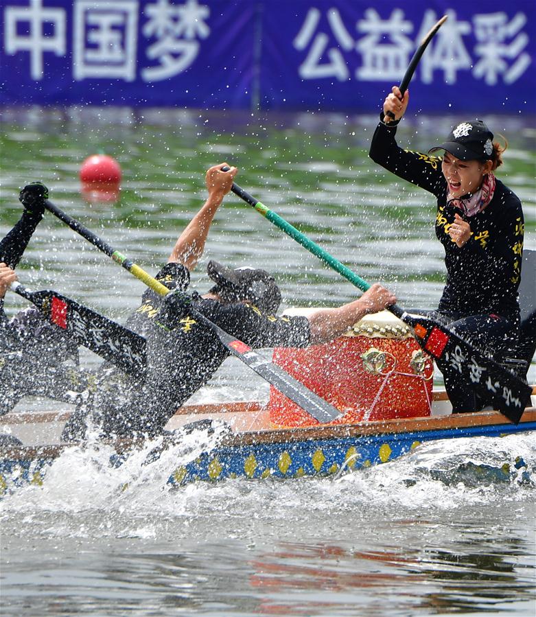 6月17日,聊城大學龍舟隊在公開混合100米直道賽晉級賽中。 新華社記者魏培全攝