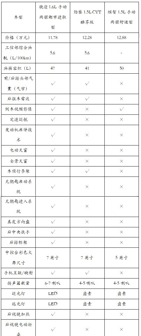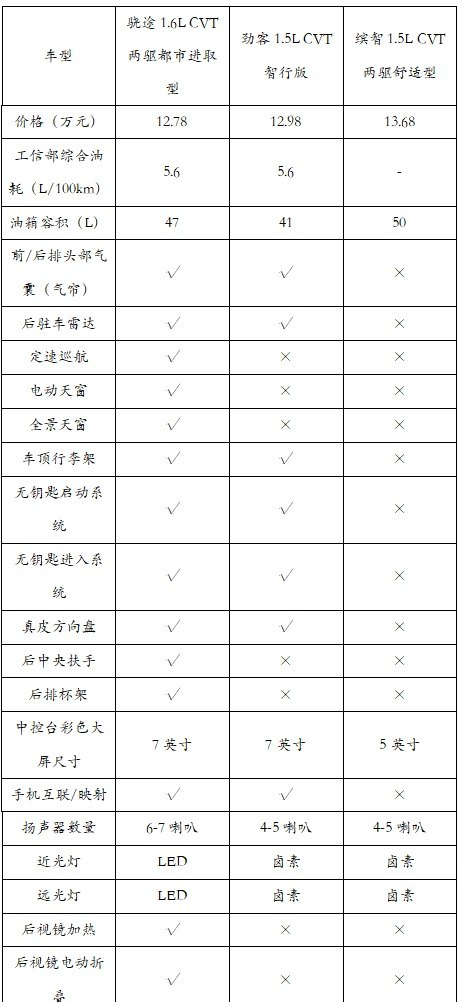 驍途1.6L CVT兩驅(qū)都市進(jìn)取型與勁 客1.5L CVT智行版、繽 智1.5L CVT兩驅(qū)舒適型進(jìn)行對比變化也不大,優(yōu)勢基本一致。