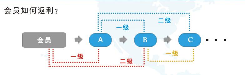 當會員推薦的AB產生消費時即可享受消費返利。一級為消費金額的15%。二級為消費金額的5%。返利模式同上!