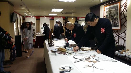 展會開幕式結束后,參展藝術家隨即進行文墨筆會。諸位藝術家齊聚畫案之上,揮毫潑墨,一展中華傳統書畫魅力。