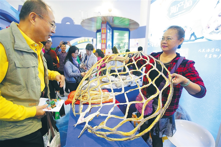 2016年(第十七屆)海南國際旅游島歡樂節國際旅游美食博覽會現場,昌江展廳的工作人員展示鰻魚產品。高林 攝