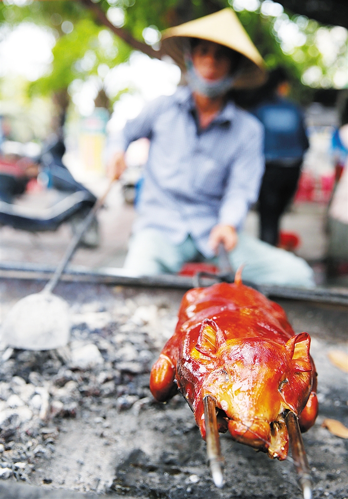 東方市姐妹四更烤豬美食店的師傅正在炭火箱上烤乳豬。此道美食在2015年首屆海南國際美食博覽會美食烹飪比賽上獲得第三名。舒曉 攝