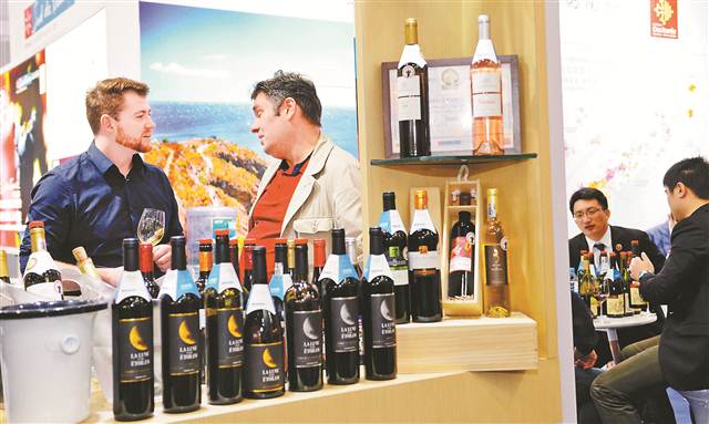 糖酒會上,外國客商在現場洽談。 記者 張錦輝 攝