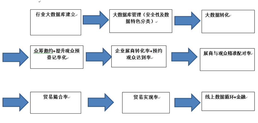 Online,建立行業數據庫,主要包括三個方面的數據庫:一是基于從業者和企業信息的大數據庫,包括名片信息和行業從業信息;二是基于產業發展的大數據庫,包括產量、價格、動態等;三是基于專業技術收集并不斷學習的大數據庫,學習型軟件系統,加上縝密的專業技術信息,逐漸形成行業自動分析的大數據庫。這些數據庫都將為會展平臺下的行業企業服務,吸引更多的參展商,并升級服務模式和盈利模式。
