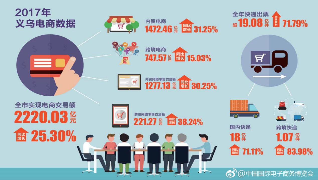 2017年,義烏市實(shí)現(xiàn)電商交易額2220.03億元,同比增長(zhǎng)25.30%。其中,內(nèi)貿(mào)電商1472.46億元,同比增長(zhǎng)31.25%;跨境電商747.57億元,同比增長(zhǎng)15.03%。內(nèi)貿(mào)網(wǎng)絡(luò)零售交易額1277.13億元,同比增長(zhǎng)30.25%;跨境網(wǎng)絡(luò)零售交易額221.27億元,同比增長(zhǎng)38.24%。