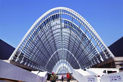 “世博城的外部全部采用幕墻裝修,其中不少幕墻板塊表面呈現立體弧度,遠看有一種海水波動的感覺。共享大廳部分形似絲綢飄帶,交叉連接‘車頭’與‘船板’。 ”據介紹,共享大廳內部主體鋼結構在空中懸挑、相互交叉,給施工帶來了巨大挑戰,項目部在施工建造前精確定位,在修建時不斷修正鋼結構在空中的位置誤差,確保兩頭同時建造的共享大廳內部鋼結構能嚴絲合縫地對接。