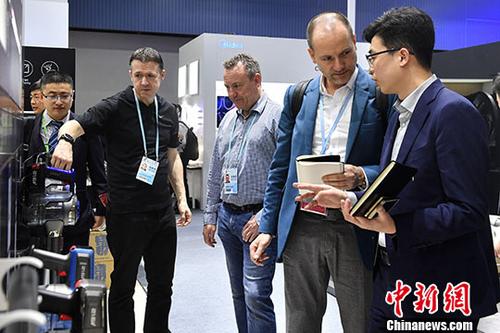 4月15日,一家電品牌參展商為采購商介紹產品性能。在第123屆中國進出口商品交易會(廣交會)上,來自34個國家和地區的617家企業在進口展區內展示產品,其中來自21個“一帶一路”沿線國家和地區的382家企業參展,展位數626個。 中新社記者 陳驥旻 攝