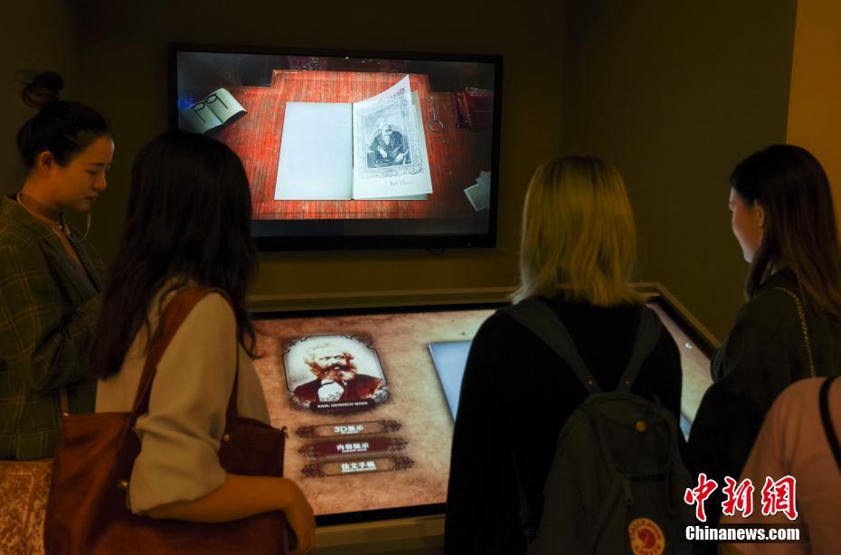 5月9日,北京“真理的力量——紀(jì)念馬克思誕辰200周年主題展覽”現(xiàn)場,觀眾被3D電子書吸引。該展覽展出馬克思、恩格斯、列寧手稿、筆記本及親筆簽名的書籍原版等珍貴文獻(xiàn)100余件,原版圖書900余種,圖片150余幅,馬克思主義題材美術(shù)作品70余幅,雕塑作品6尊等。 中新社記者 賈天勇 攝