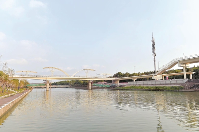據有關負責人介紹,二層步廊的燈光效果將集中體現 “七彩聚虹 夢想筑橋”的主題,跨新角浦兩岸廊道部分燈光和跨河橋梁燈光將融為一體,建成后,將向市民呈現一幅廊轉燈回、虹臥綠波、飛鳥振翅的瑰麗光影。目前,燈光工程的相關配套設施管線預埋工程已在施工中,設計方案也將在原有基礎上優化升級。
