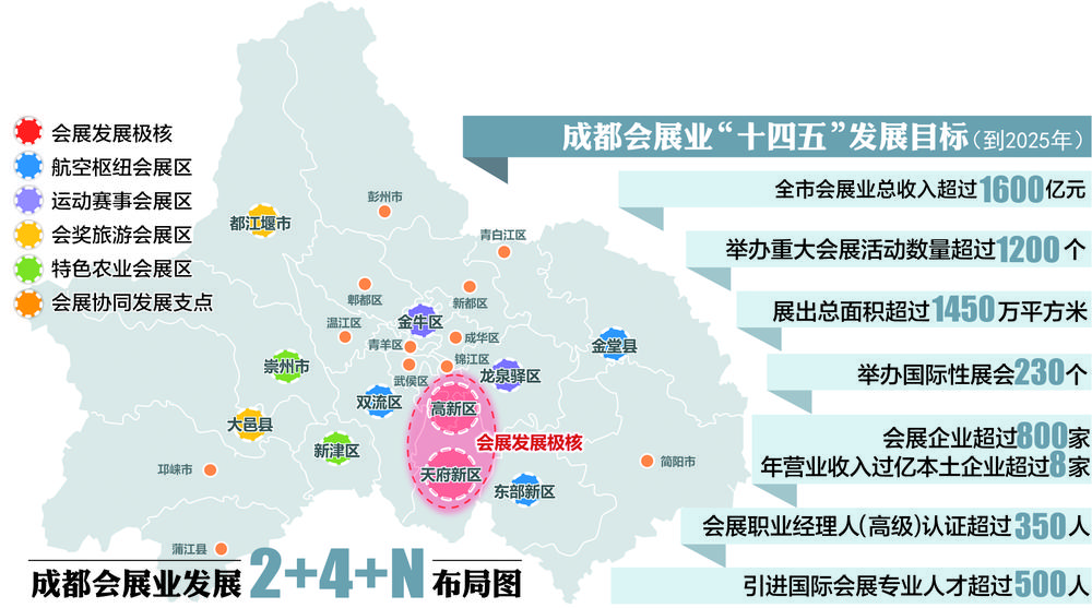 《規(guī)劃》明確了“十四五”時期發(fā)展目標(biāo)。到2025年,立足會展業(yè)高質(zhì)量發(fā)展,形成優(yōu)質(zhì)高效、結(jié)構(gòu)優(yōu)化、競爭力強(qiáng)的現(xiàn)代會展產(chǎn)業(yè)體系,將成都建設(shè)成為具有全球影響力的國際會展之都。