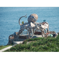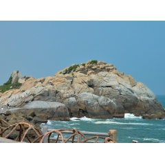 放雞島島景色秀麗,石景多姿,沙灘、蝕洞、巖石、林木、陽光、海水俱全。島的東北岸長年受風浪的沖刷,巖石聳立,千姿百態,氣勢雄奇。遠處,水天一色,煙波浩淼;近處,全是巨大險峻的礁石,驚濤拍岸,卷起千堆雪。岸邊,有一雞頭狀的巨石立于傾斜的石基上,好像一位醉心于音樂的老人在聆聽著“海韻”,故名“仙石聽濤”。島的北面,港灣如同初升的月牙,緩緩的坡度,潔白的細沙,柔和的海浪,是難得的天然浴場。正東與東南岸,俗稱"雞尾"部,集奇、雄、壯、闊于一體,景色遠勝"雞頭",是放雞島觀景覽勝的精華部位。島的東南部海域面臨浩瀚南海,濤聲如吼,常年浪擊島岸懸崖峭壁,雄偉堅挺,奇礁怪石遍布:景觀形象豐富,勢態逼真,唐代至今稱奇景觀有“南天飛石”“雞海迥瀾”“仙石聽濤”“羊礁觀日”“鯉魚吐珠”“群石眠瀾”。